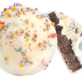 Ein dunkler Riegel mit weißem Sahneboden und zerkleinerten Mini-Disco-Peanuts.