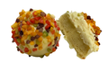 Ingredienten: Suiker, wei-eiwit concentraat, tapioca vezel, plantaardige olie (zonnebloem, palm, raapzaad), volle melkpoeder, cacaoboter, bevochtigingsmiddelen: glycerol, sorbitol, tarwebloem, roomkaaspoeder, water, plantaardig vet (palm, raapzaad, shea-olie), emulgatoren: lecithine (zonnebloem, soja), polysorbaat 60, mono- en diglyceriden van vetzuren, zuurteregelaar: citroenzuur, natuurlijke aroma, zout, conserveermiddel: kaliumsorbaat, invertsuikerstroop, rijsmiddel: natriumwaterstofcarbonaat, natuurlijk vanille-extract, kleurstoffen: carotenen, concentraat van citroen, radijs, zwarte bes, appel, spirulina, saffloer, paprika, wortel en hibiscus.
