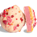 Ein Riegel aus rotem Samt mit einer köstlichen Schicht aus Zitronenknusper. Umhüllt von weißer Schokolade und verziert mit Herzen.